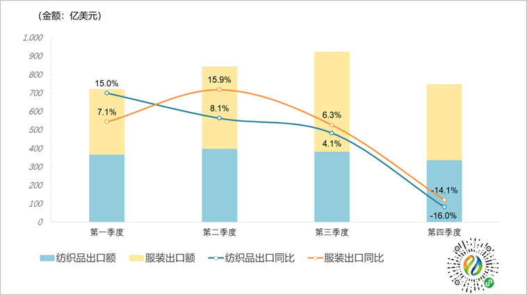 圖1. 2022年全國紡織品、服裝出口季度統計