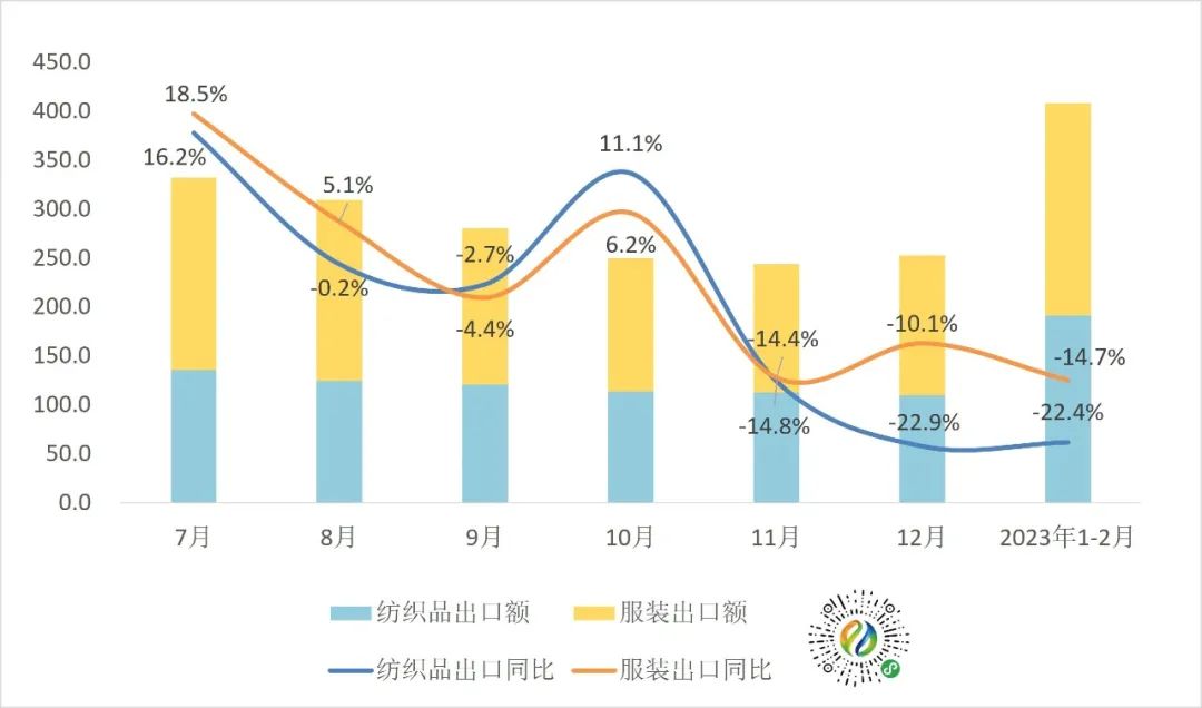 圖1. 2022~2023年全國紡織品、服裝出口月度統(tǒng)計 (金額:億美元)