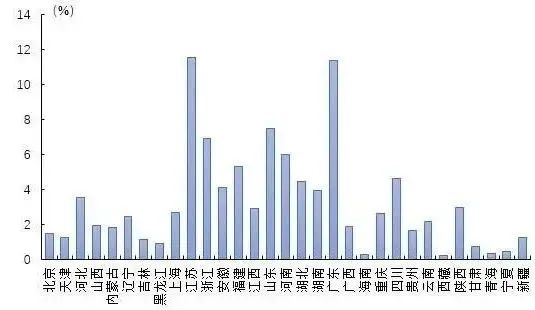 中國產(chǎn)業(yè)結(jié)構(gòu)升級在過去20年取得了長足的進步。從圖2可以看到,絕大多數(shù)省份第二產(chǎn)業(yè)占比均出現(xiàn)明顯的下降,隨著經(jīng)濟發(fā)展第三產(chǎn)業(yè)的比重在各省都將上升,各省普遍實現(xiàn)了產(chǎn)業(yè)結(jié)構(gòu)升級。2020年在同一區(qū)域內(nèi)各省的產(chǎn)業(yè)結(jié)構(gòu)相似程度較高。從圖3可以看到,華北地區(qū)中,除北京外,天津、河北、山西、內(nèi)蒙古第二產(chǎn)業(yè)占比較為接近;華東地區(qū)中,除上海外,江蘇、浙江、安徽、福建、江西、山東的第二產(chǎn)業(yè)比重接近;中部地區(qū)中,河南、湖北、湖南的第二產(chǎn)業(yè)占比基本相當。