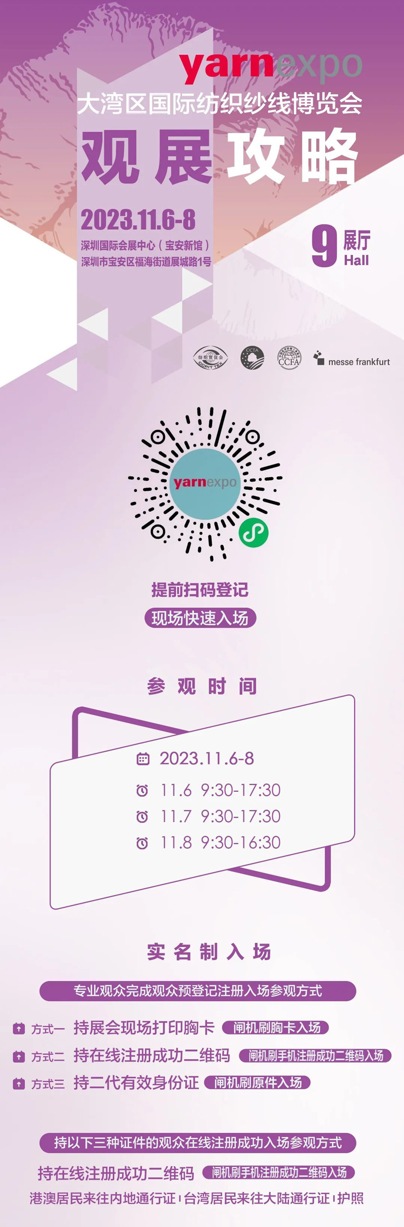 您現(xiàn)在的位置是:首頁(yè) > 要聞 yarnexpo大灣區(qū)紗線展 | 參觀指南出爐 交通攻略請(qǐng)收藏 來(lái)源:yarnexpo紗線展 發(fā)布日期:2023-11-03 字體: 【小】 【中】 【大】 大灣區(qū)國(guó)際紡織紗線博覽會(huì) 2023.11.6-8 深圳國(guó)際會(huì)展中心(寶安新館)9號(hào)展廳 觀眾預(yù)登記請(qǐng)掃描下方二維碼 熱門文章: 聚力專精特新 共筑產(chǎn)業(yè)未來(lái)—2026中國(guó)紡聯(lián)春季聯(lián)展【紡織專... [2026-02-05] 鏈接全球家紡商機(jī),2026intertextile秋冬展展位... [2026-02-04] 數(shù)讀2025 | 盤點(diǎn)全年中國(guó)紡織行業(yè)對(duì)外貿(mào)易表現(xiàn) [2026-02-03] 以改革創(chuàng)新精神將社會(huì)工作各項(xiàng)決策部署落實(shí)到位--與會(huì)代表深入... [2026-01-28] 鏈接全球紡業(yè),共啟“十五五”新篇--2026年紡織貿(mào)促會(huì)邀您... [2026-01-27] 展會(huì)直通車