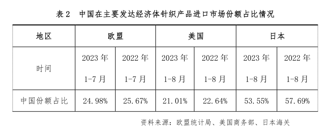 從市場份額來看,今年以來,主要發達經濟體如美國、歐盟等對針織產品的進口需求均有所下降,同時我國產品在上述市場中的份額占比也有所減少。1~7月歐盟針織產品進口額同比下降12.55%,其中對我國進口同比下降14.89%;1~8月美國針織產品進口額同比下降27.71%, 其中對我國進口同比下降32.93%;1~8月日本針織產品進口額同比增長1.52%,其中對我國進口同比下降4.15%。