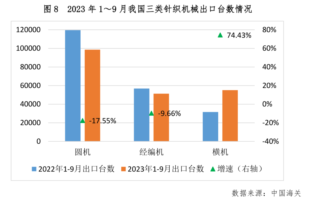 另據中國海關數據,1~9月我國圓機、經編機分別出口98000余臺和51000余臺,同比分別下降17.55%和9.66%;同期,橫機的出口數量為55000余臺,同比大幅上揚74.43%。從出口分布情況來看,印度、越南、孟加拉、土耳其等為我國針織機械的主要出口目的國,該四國的占比之和約占我國針織機械出口總額的50%。